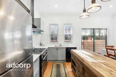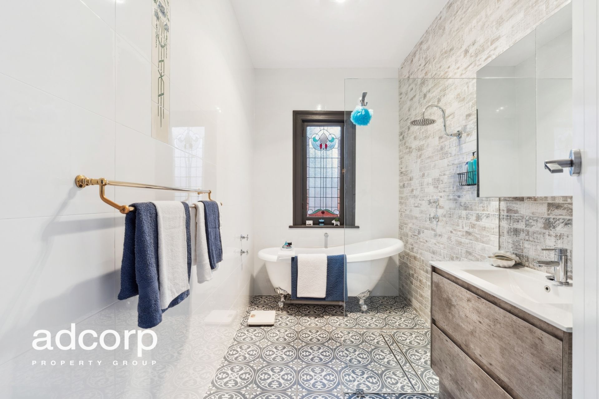 • Stunning bathroom with claw foot bath, 10-foot floor to ceiling tiles and decorative leadlight window